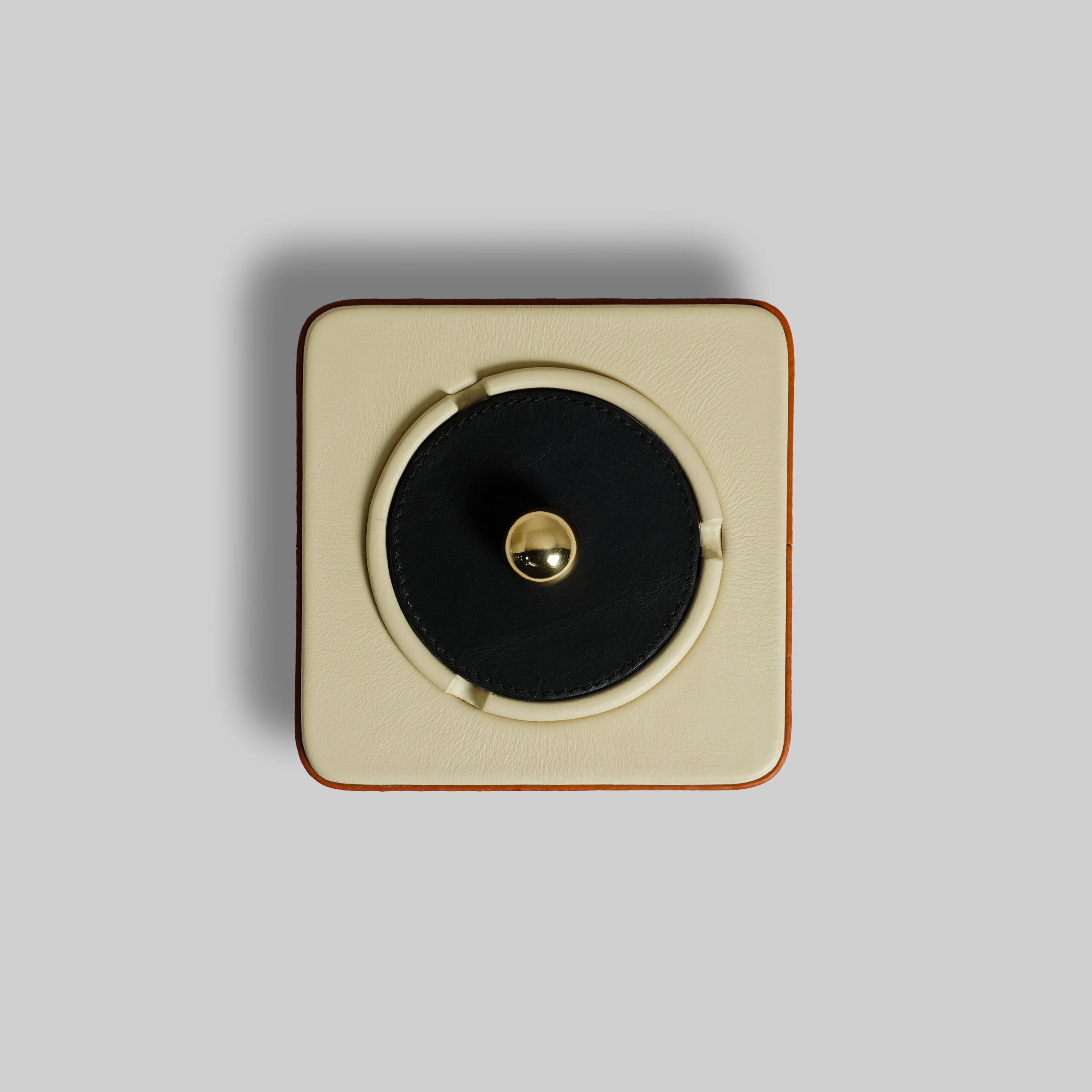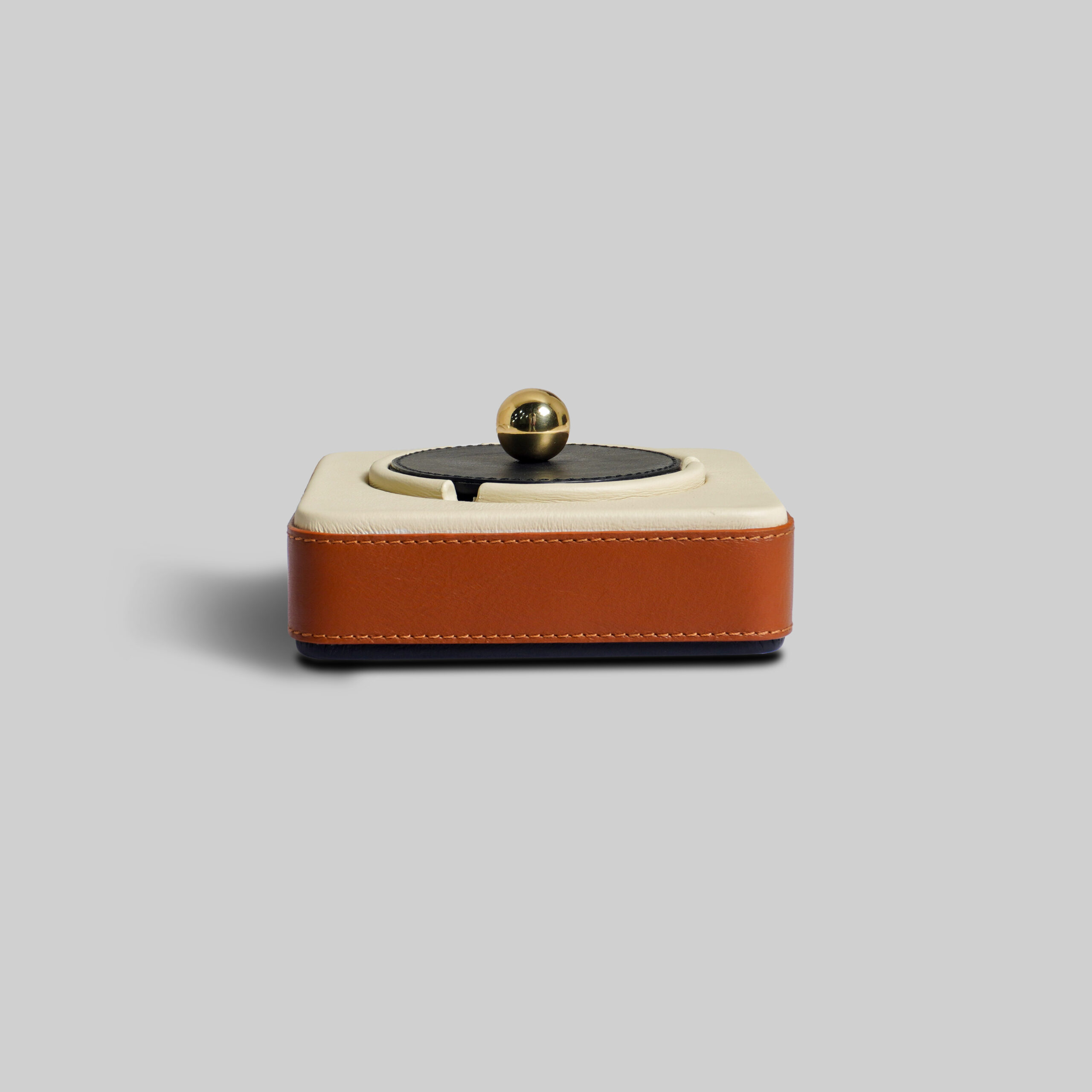Give a luxury experience to your chill time with this elegant ashtray, crafted in premium leather with a lid design having a small brass knob. This ashtray combines practicality with modern design. The overall color combination evokes a thoughtful approach to home decor as well as serving the purpose.