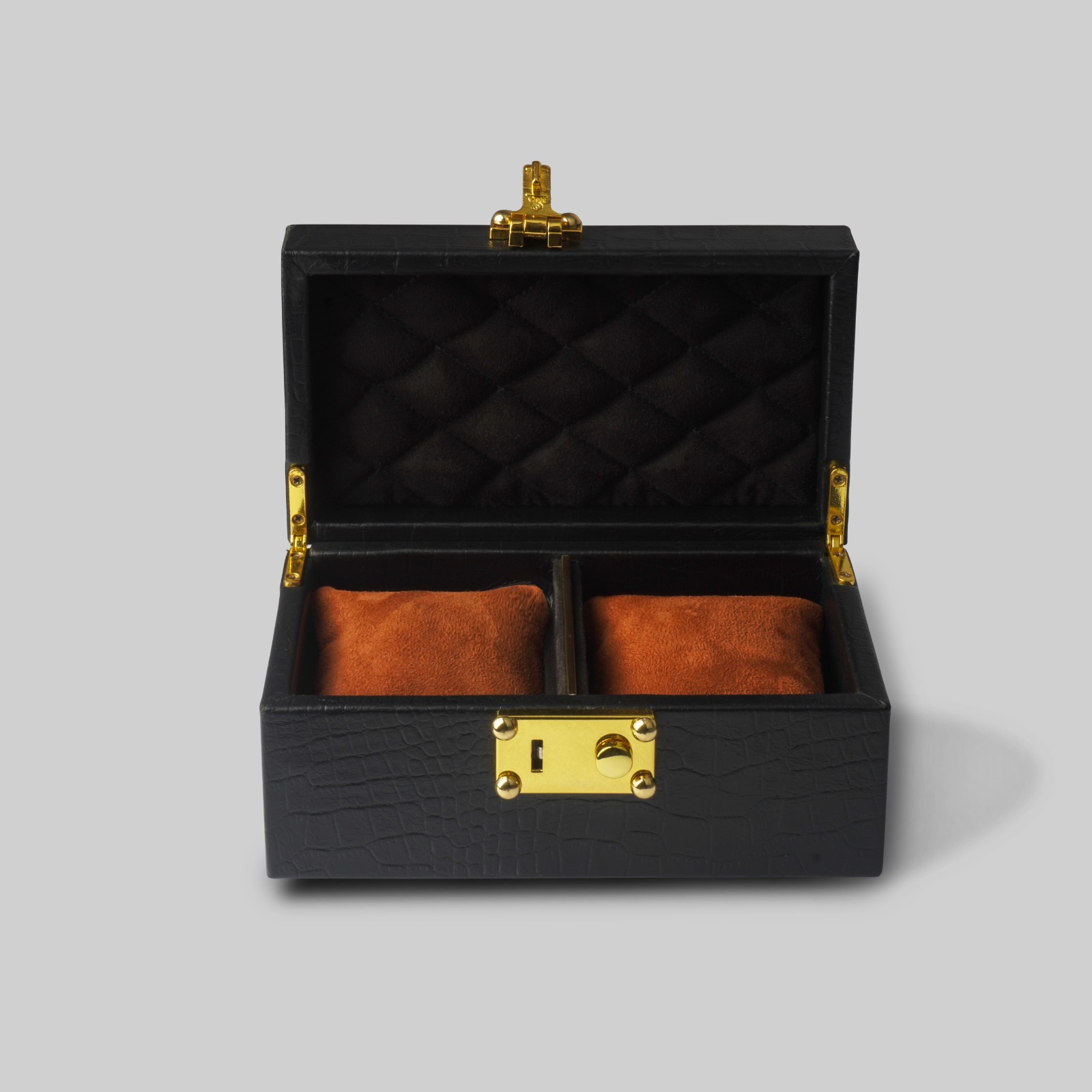 The Black Buck watch Box is a luxurious leather box that features a textured grainy finish and a deer symbol on top. Its interior is well-divided into two sections for perfectly keeping your watches. The lock is made with shiny metal and a quick-pressing button, adding a modern touch to the design.
