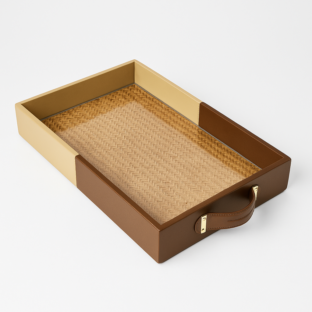 Keep your belongings and decor stuffs stylishly organized with our Dual Tone Tray. Designed for both simplicity and practicality, this exquisite piece is crafted from genuine leather, offering a smart, sophisticated dual shade finish that adds a touch of elegance in any space. Its thoughtful design invites easy organization of your daily stuffs making it a modern choice while from the inside the rattan finish gives it a complete elegant look. The leather handles on either side makes it handy to use and carry. A perfect piece to evoke minimalist home decor vibes.
