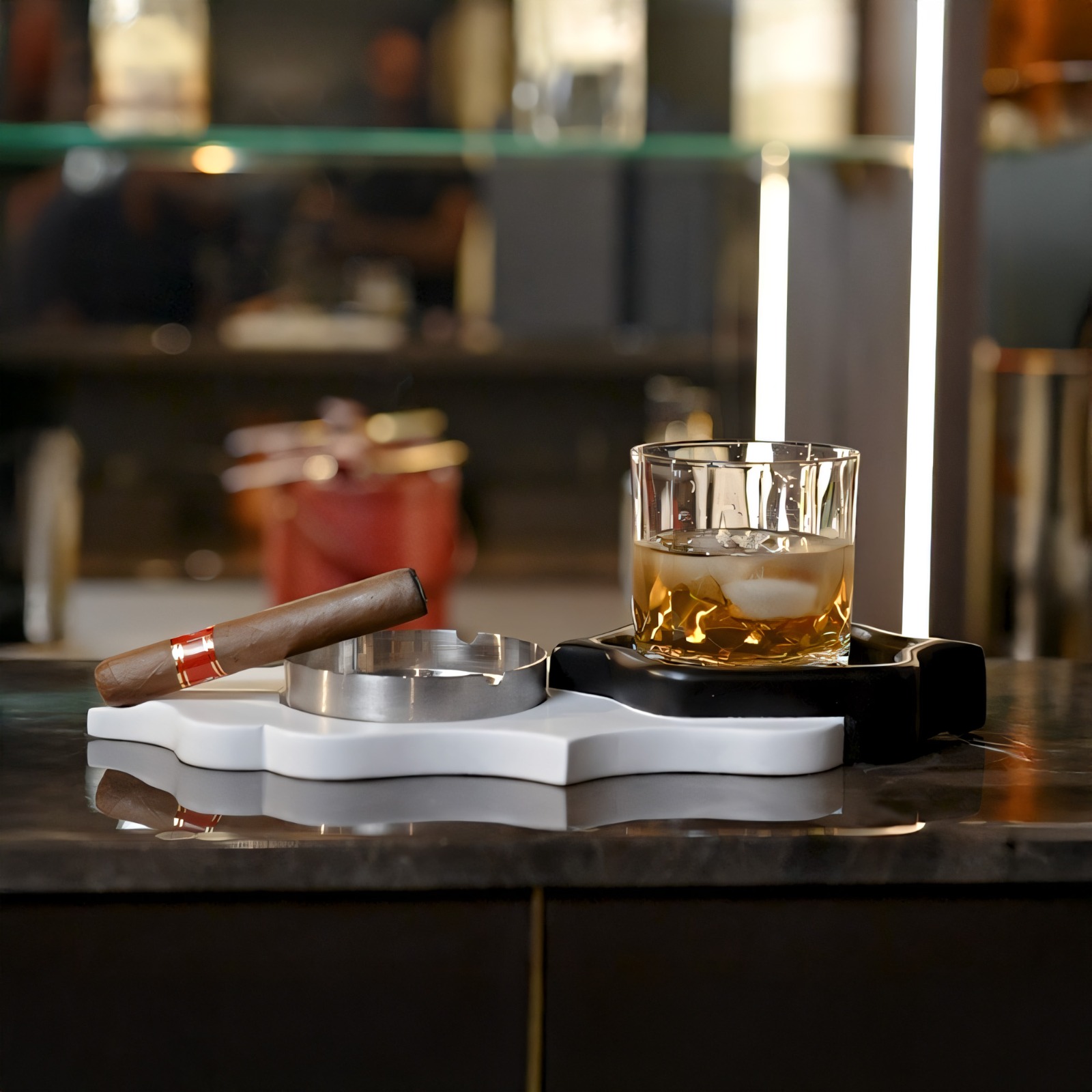 The built-in glass holder is perfect for keeping your drink conveniently paired with cigars, cigarettes, or accessories. Designed with a smooth, easy-to-clean surface, it offers both practicality and style. Its compact size makes it a versatile addition to tabletops, patios, or lounges, seamlessly blending functionality with elegance.