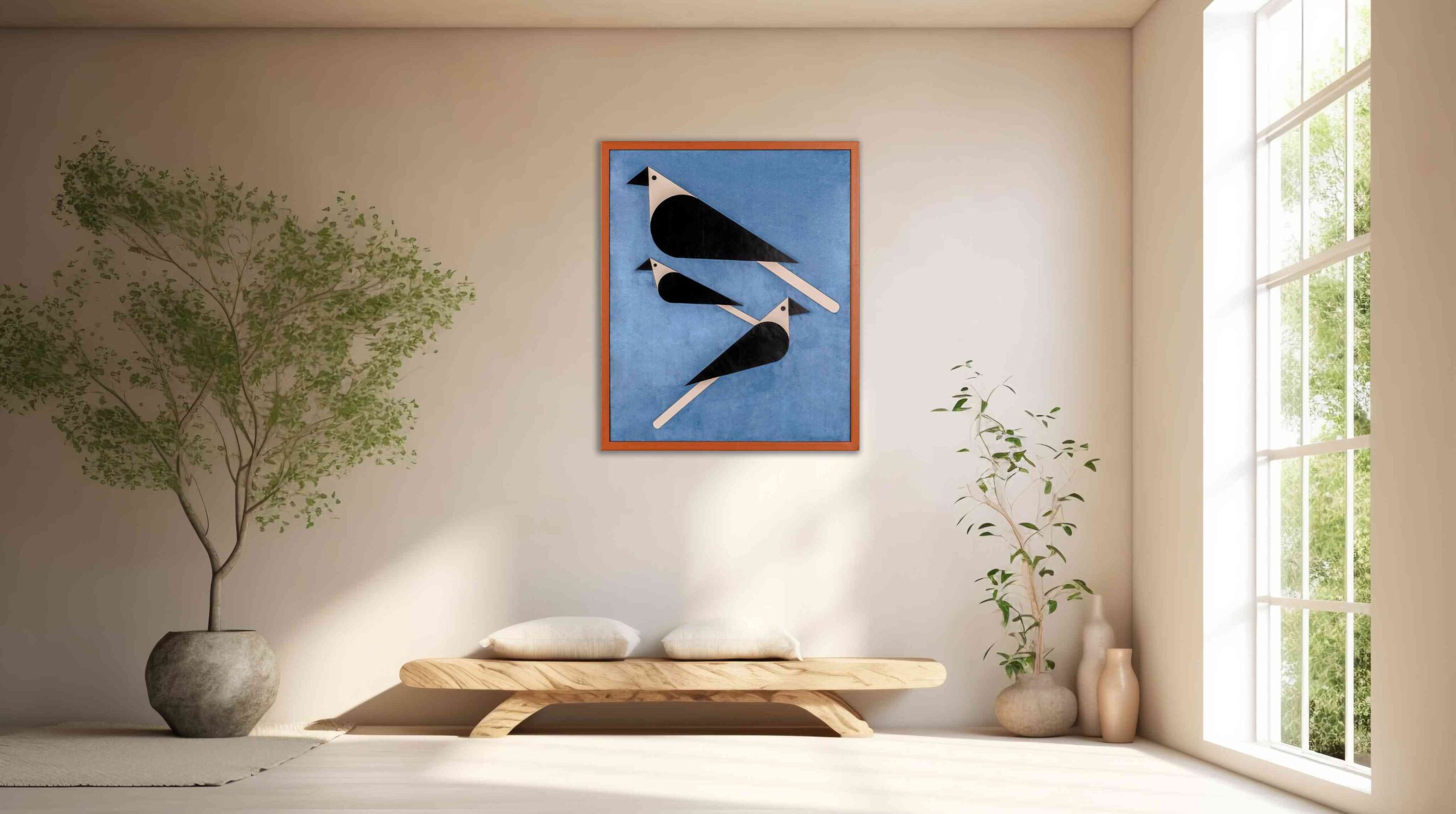 This striking wall art captures the essence of freedom in a minimalist yet impactful design. Three stylized birds in black and white made from leather stand out against a calming blue suede backdrop, evoking a sense of serenity and movement. The clean lines and geometric shapes create a contemporary aesthetic that will elevate any space. This piece is a perfect blend of art and modern home decor design.